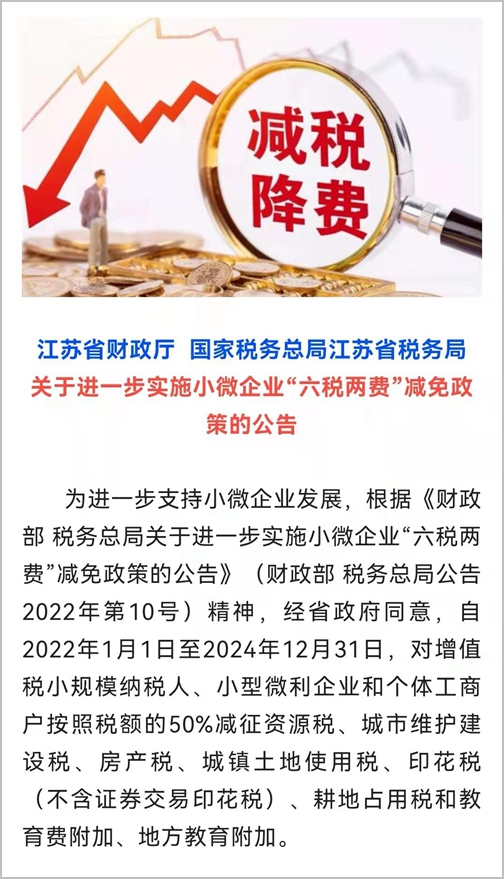 江苏发布公告进一步实施小微企业“六税两费”减免