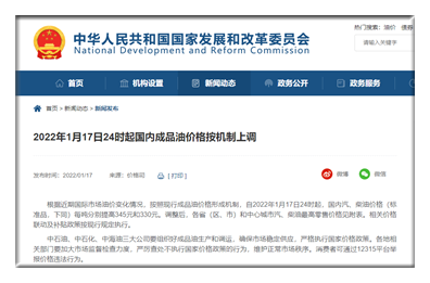 据国家发展和改革委员会官网消息,自2022年1月17日24时起,国内汽、柴油价格(标准品,下同)每吨分别提高345元和330元。调整后,各省(区、市)和中心城市汽、柴油最高零售价格见附表。相关价格联动及补贴政策按现行规定执行。中石油、中石化、中海油三大公司要组织好成品油生产和调运,确保市场稳定供应,严格执行国家价格政策。